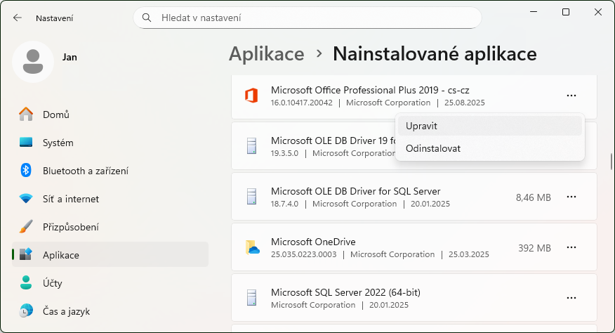 V Nastavení systému vyberte Aplikace a Nainstalované aplikace a najděte program, který používáte pro správu emailové schránky. Pomocí trojtečky na konci řádku vyvolejte Opravu programu.