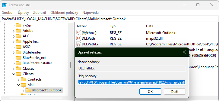 Zkontrolujte, zda v registrech Windows existují správné odkazy na používané rozhraní MAPI