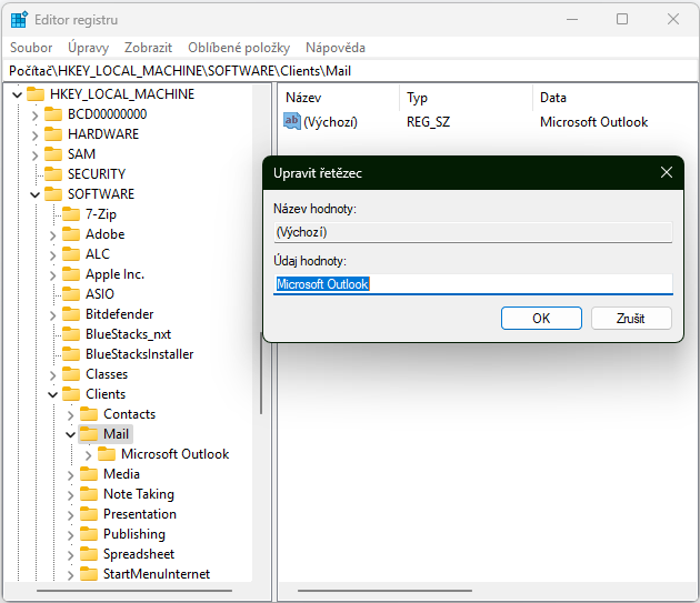 Např. HKEY_CURRENT_USER\SOFTWARE\Clients\Mail\Microsoft Outlook