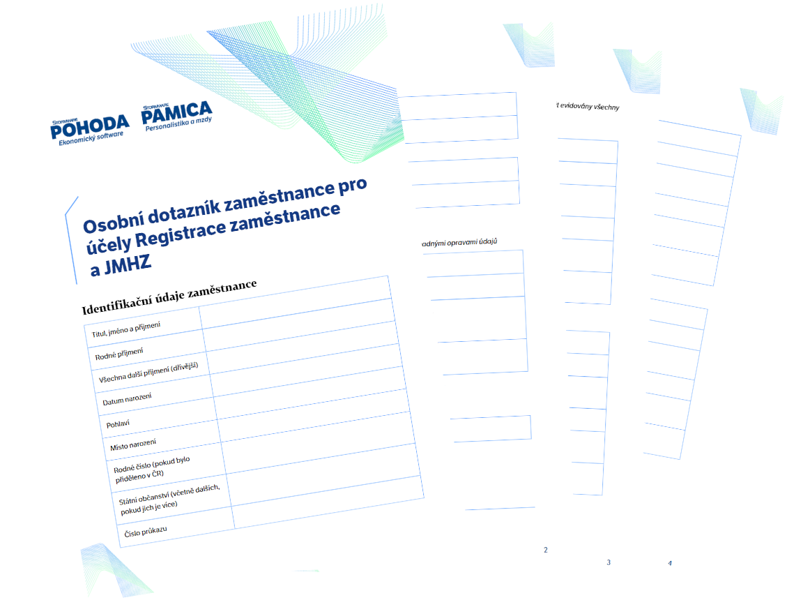 Osobní dotazník s požadovanými poli pro registraci zaměstnance a JMHZ najdete také přímo v Pohodě a Pamice jako novou tiskovou sestavu, která navíc předvyplní údaje o zaměstnanci. K dotazníku PAMICA je sestavený speciální průvodce vyplněním.