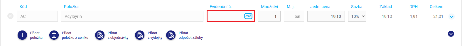 Evidenční číslo můžete na doklad vložit i dodatečně kliknutím na ikonu v poli Evidenční č.