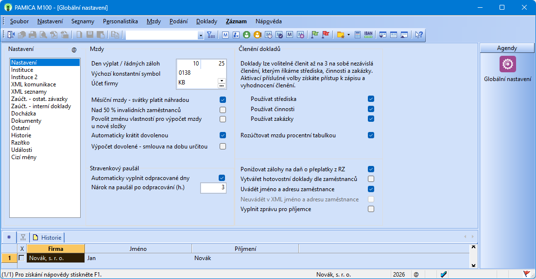 Od ledna 2026 se opět změní osvobozená část stravenkového paušálu. Na základě vašich četných požadavků jsme zapracovali novinku, a to automatické vyplňování počtu odpracovaných dní pro účely výpočtu stravenkového paušálu. Od roku 2026 si v agendě Globální nastavení můžete aktivovat automatické vyplňování odpracovaných dní do složky Z21 Stravenkový paušál.