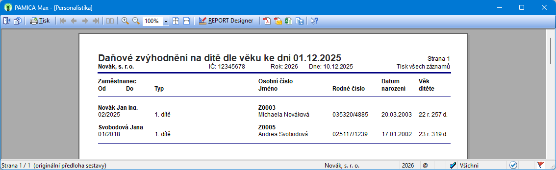 Do agendy Personalistika jsme přidali novou tiskovou sestavu Daňové zvýhodnění na dítě dle věku. Na sestavu vstoupí zaměstnanci, kteří na záložce Daně a pojistné uplatňují daňové zvýhodnění na děti. Věk dítěte je vypočten k datu uvedenému v poli Sestavit k datu na dialogu Tisk před náhledem na sestavu.