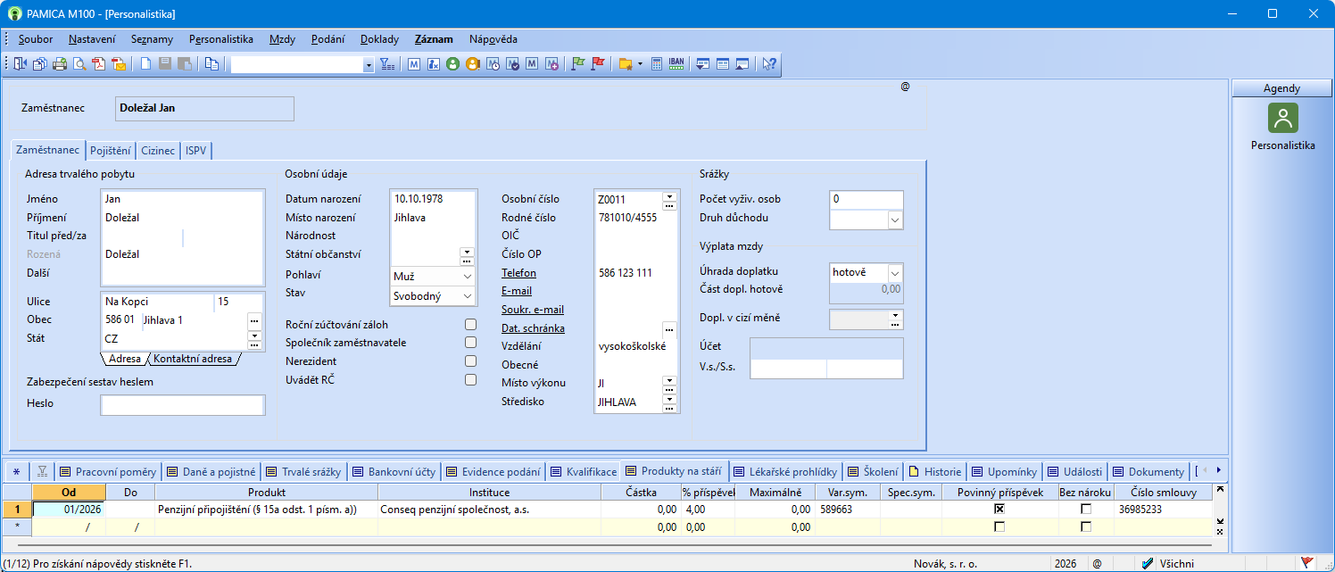 Následně těmto zaměstnancům zadáte příslušný produkt spoření na stáří na záložku Produkty na stáří v agendě Personalistika. Zde vyberete produkt Penzijní připojištění, resp. Doplňkové penzijní spoření, zvolíte příslušný penzijní fond, uvedete % příspěvku a zatrhnete, že se jedná o povinný příspěvek ve stejnojmenném sloupci. Výše příspěvku zaměstnavatele činí 4 %.