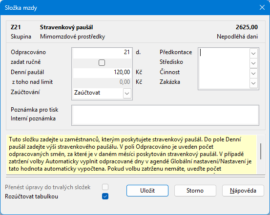Pokud používáte hromadné vložení složky Z21 Stravenkový paušál, případně načtení z .csv souboru nebo vložení přímo z docházkového systému, volbu pro automatický výpočet odpracovaných dní v agendě Globální nastavení doporučujeme nechat neaktivní. V opačném případě by i v těchto případech docházelo k dalším přepočtům počtu odpracovaných dní na složce.