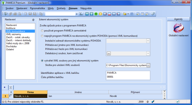 >V agendě Globální nastavení/XML komunikace byl doplněn další způsob práce s programem PAMICA, a to konkrétně možnost vytvářet XML soubory pro jiný ekonomický systém. Při zaúčtování mzdových záznamů, resp. záloh se vytvořené doklady uloží do XML dokumentu ve vybrané složce, kde jsou připraveny pro import do jiného ekonomického sytému. Při zaúčtování mzdových záznamů, záloh mzdy či úrazového pojištění existuje také možnost výběru číselné řady pro ostatní závazky a interní doklady.