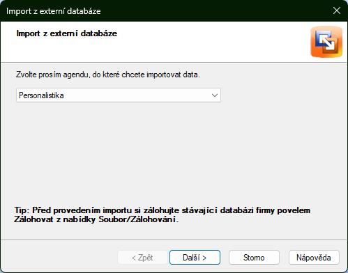 V průvodci importem agendy na první straně vyberte agendu Personalistika.
