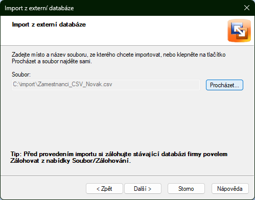 Na 2. straně průvodce zvolte pomocí tlačítka Procházet *.csv soubor, ze kterého chcete data importovat.
