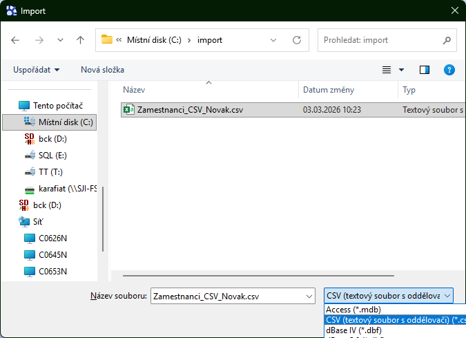 Pokud se v dialogu výběru soubor nezobrazí, přepněte Filtr vpravo dole na volbu: CSV (textový soubor s oddělovači).