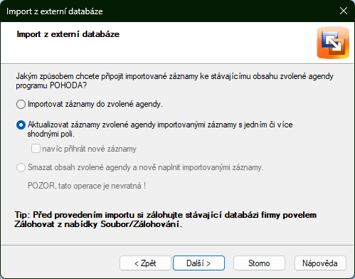 Na 3. straně průvodce si vyberte typ importu: Aktualizovat záznamy zvolené agendy importovanými záznamy...