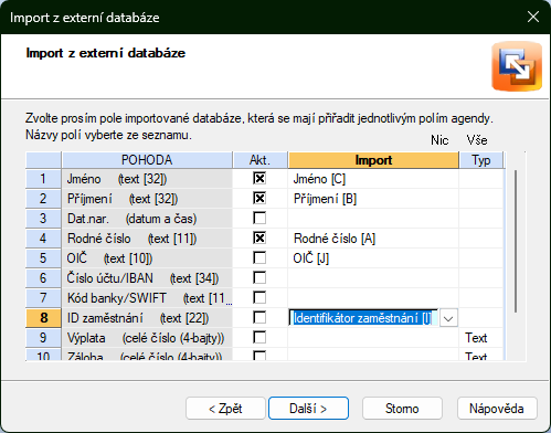 Příklad: Pro import ID zaměstnání je nutné ve sloupci Import zvolit Identifikátor zaměstnání [I], protože se v souboru jmenuje jinak než v databázi.