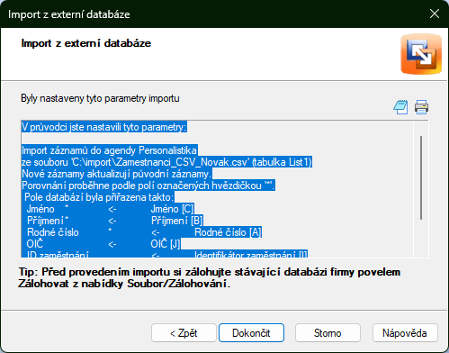 Na poslední straně se zobrazí přiřazení sloupců a vlastnosti importu. Po stisku tlačítka Dokončit se provede import.