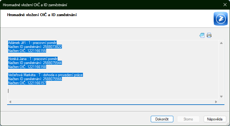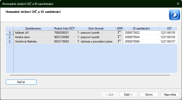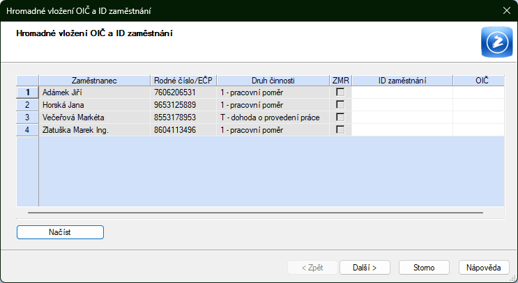 OIČ a ID zaměstnání se hromadně vloží všem zaměstnancům, i cizincům, kteří nemají přiděleno rodné číslo.
