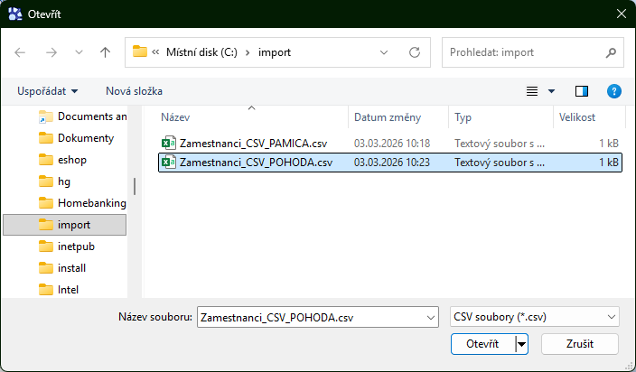 Pokud se v dialogu výběru soubor nezobrazí, přepněte Filtr vpravo dole na volbu: CSV soubory (*.csv).