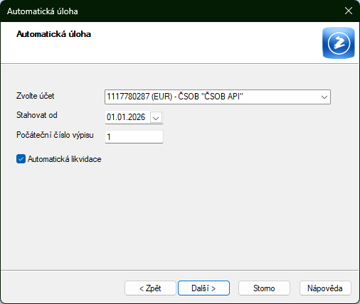 Automatická likvidace - pokud bude volba zapnutá, po úspěšném stažení dojde k pokusu o likvidaci dokladů dle pravidel párování pro vybranou službu Homebankingu.