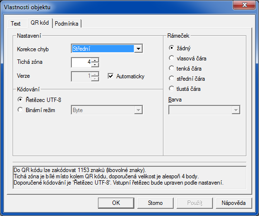 V programu Report Designer zvolíte povel Vložit/QR kód. Zobrazí se dialogové okno Vlastnosti objektu, ve kterém na záložce Text vložíte požadovaná databázová pole, nebo zapíšete text ručně. Na záložce QR kód určíte další parametry vytvářeného QR kódu, jako třeba způsob zakódování, tichou zónu nebo rámeček.