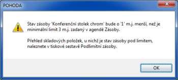 Je-li při výdeji, rezervaci či vkládání skladových položek do skladové reklamace jejich stav pod minimálním limitem, POHODA Vás na to upozorní.