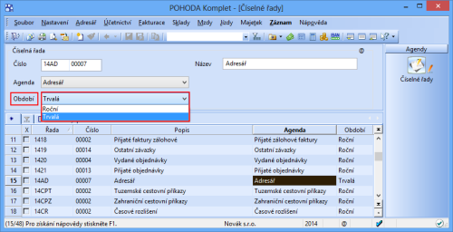 Do agendy Číselné řady jsme přidali nové pole Období, které slouží k tomu, abyste si nastavili období platnosti číselné řady. Na výběr máte trvalou, či roční platnost. Aktuálně je možné provést toto nastavení pouze pro agendu Adresář.