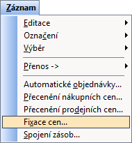 Hromadnou změnu nastavení fixací prodejních cen provedete v agendě Zásoby pomocí průvodce Nastavení fixace cen, kterého vyvoláte z nabídky Záznam/Fixace cen… V něm vyberete, zda chcete provést zafixování, nebo odfixování, označíte požadované ceny, a v případě fixace i hodnoty, které se mají zafixovat.