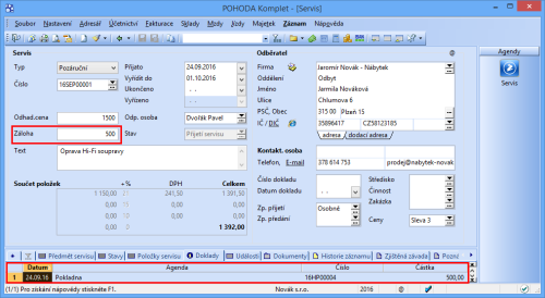 Také pro agendu Servis si připravila POHODA drobné vylepšení. Nyní máte lepší přehled o přijatých zálohách od zákazníka na provedení servisních prací.