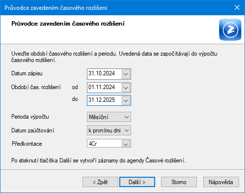 Datumová pole se rovněž testují i v průvodci zavedením časového rozlišení, do kterého jsme přidali i pole Datum zápisu. Díky rozšířené kontrole se záznamy časového rozlišení nezahrnou do účetnictví, které je ke zmíněným datům uzamčeno.