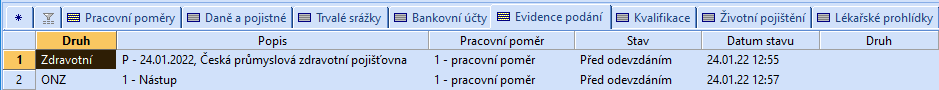 Na záložce Evidence podání uvidíte i další elektronicky podané tiskopisy, například Evidenční list důchodového pojištění (ELDP), Oznámení o nástupu do zaměstnání (ONZ), Příloha k žádosti o dávky nemocenského pojištění (Podání NEMPRI) nebo Oznámení o záměru uplatňovat slevu na pojistném (OZUSPOJ). Na příslušné podání se můžete přepnout pomocí povelu Otevřít z místní nabídky, kterou vyvoláte stisknutím pravého tlačítka myši na vybraném záznamu.