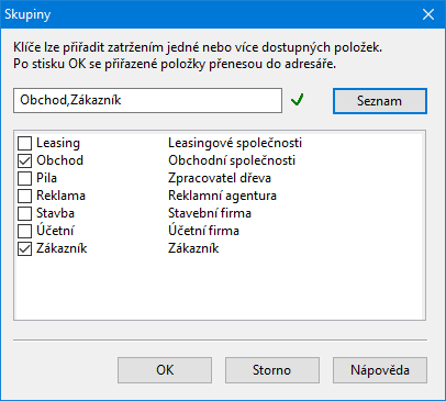 Často používané skupiny a klíče je dobré zařadit do seznamu, který je součástí databáze programu POHODA. Kromě těchto předem definovaných skupin můžete do téhož pole adresáře ručně zapisovat ty skupiny nebo klíče, které v seznamu obsažené nejsou. Tlačítko