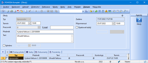Agenda je společná pro všechny účetní jednotky. Při práci v programu POHODA budete v pravý čas informováni o všech svých upomínkách či uplynulých termínech úkolů, bez ohledu na skutečnost, ve které účetní jednotce se právě nacházíte.