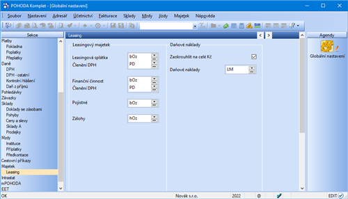 Zaúčtování leasingového majetku si usnadníte uvedením výchozích předkontací v agendě Globální nastavení v sekci Majetek/Leasing.