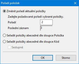 Pořadí položek dokladu ovlivníte povelem Pořadí z kontextové nabídky po stisku pravého tlačítka myši. Vybrané položce dokladu můžete sami určit její pořadí ručním zadáním čísla řádku, nebo můžete všechny položky řadit abecedně podle sloupců Položka nebo Kód.