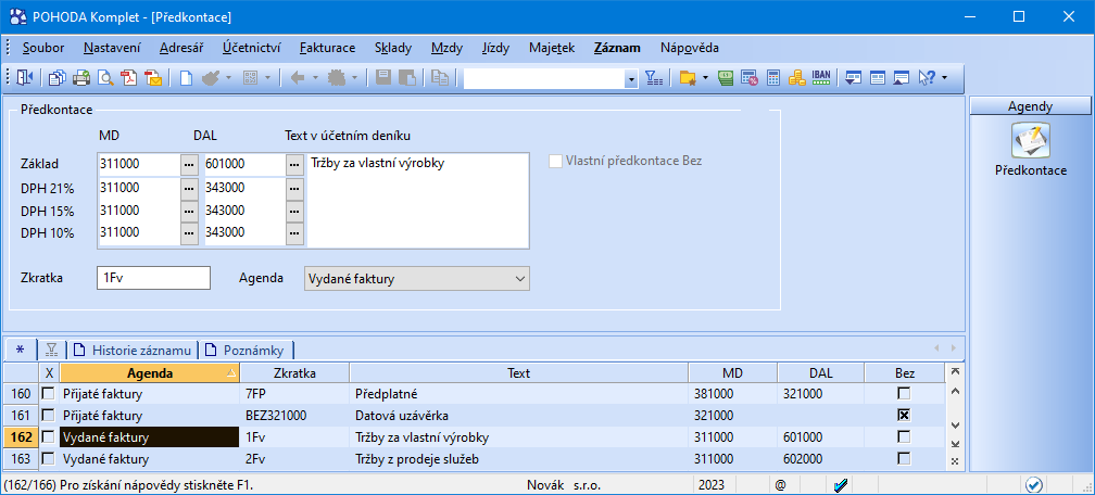 V programu POHODA si můžete předkontace nadefinovat v agendě Předkontace, která se nachází v nabídce Účetnictví. Využívat je můžete v každé agendě, ve které se o jednotlivých dokladech účtuje.