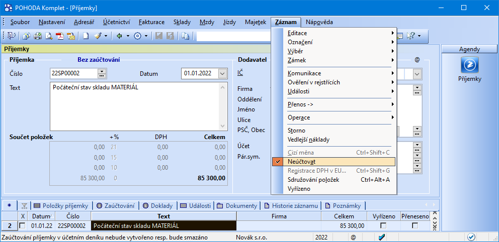 Pro úplnost připomínáme, že počáteční stavy skladových zásob zadáte při zahájení práce v programu do agendy Příjemky jako první příjemku, ve které vyplníte u každé zásoby odpovídající počáteční množství. Vzhledem k tomu, že počáteční stavy účtů třídy 1 zadáváte v agendě Počáteční stavy účtů, je nutné u této příjemky zvolit povel Neúčtovat z nabídky Záznam, jinak by došlo k dvojímu zaúčtování skladových pohybů. Až provedete datovou uzávěrku, vše potřebné pro začátek dalšího účetního období se nastaví automaticky.