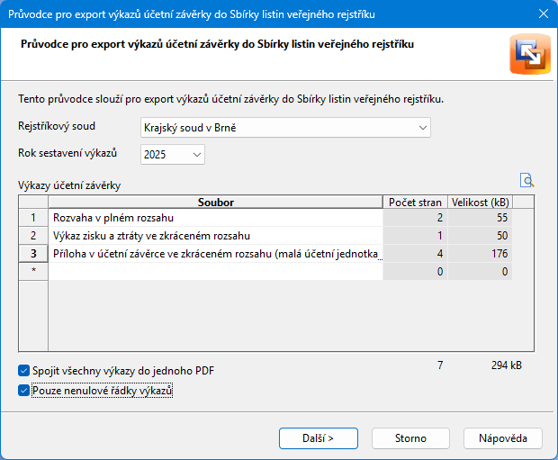Do Průvodce pro export výkazů účetní závěrky do Sbírky listin veřejného rejstříku jsme zapracovali volbu Pouze nenulové řádky výkazů. Při zatržení této volby je PDF s výkazy (Rozvaha, Výkaz zisku a ztráty, Přehled o změnách vlastního kapitálu) sestavené bez nulových řádků.