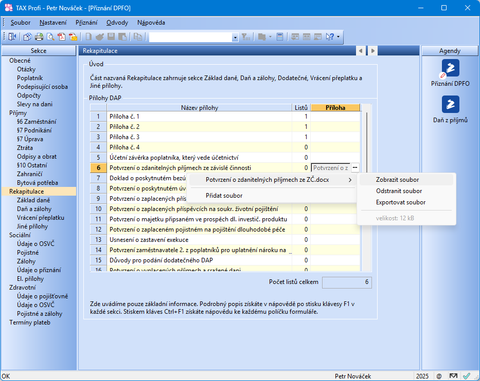 U konkrétní přílohy, kterou máte k daňovému přiznání vloženou, klikněte na trojtečku a zvolte nově přidaný povel Zobrazit soubor. Příloha se poté otevře v externí aplikaci s atributem „jen pro čtení“. Takto je možné zobrazit přílohu vloženou jak v sekci Rekapitulace (pouze DPFO, DPFO-ZČ), tak v sekci Jiné přílohy.