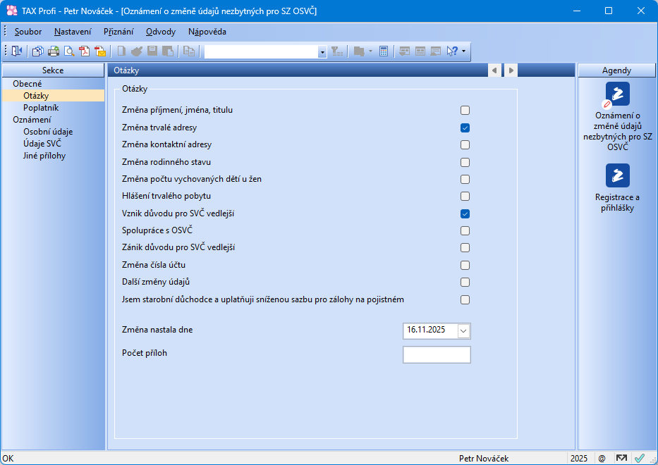 V sekci Otázky zatrhněte příslušnou změnu, čímž zpřístupníte sekci Osobní údaje, příp. sekci Údaje o SVČ s poli pro vyplnění změny.