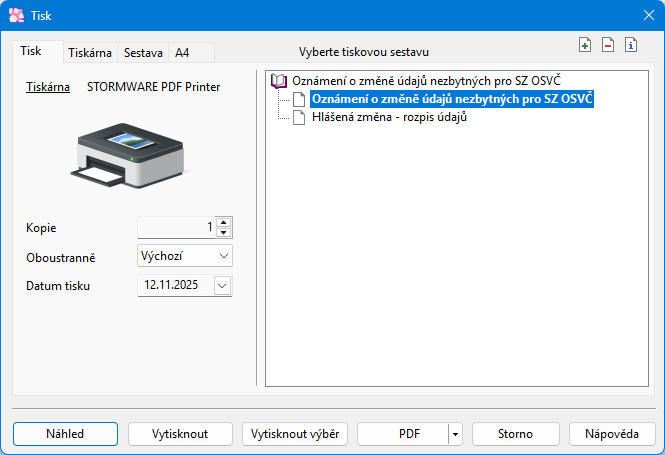 V dialogovém okně Tisk najdete nové tiskové sestavy Oznámení o změně údajů nezbytných pro SZ OSVČ a Hlášená změna – rozpis údajů.